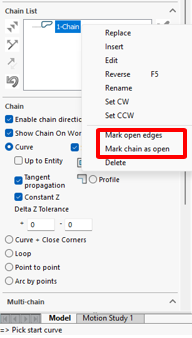 - Cách để chọn lựa và thiết lập một cạnh hở trong một vùng pocket như hình ảnh phía trên thì chúng ta sẽ sử dụng công cụ Mark open edges hoặc Mark chain as open.